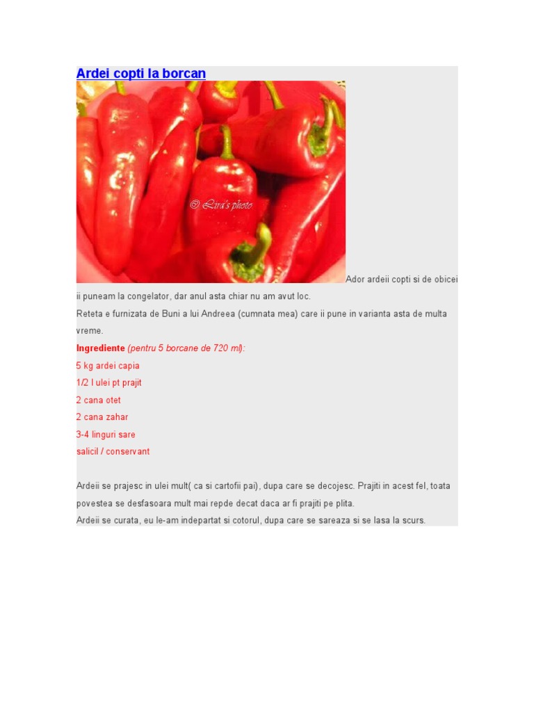 Ardeii copti si curatati se asaza in borcane se adauga dupa dorinta la fel ca mai sus. Usturoi mult si compozitia trebuie sa aiba cantitati egale de otet si zahar. Aceeasi poveste in fiecare an.
